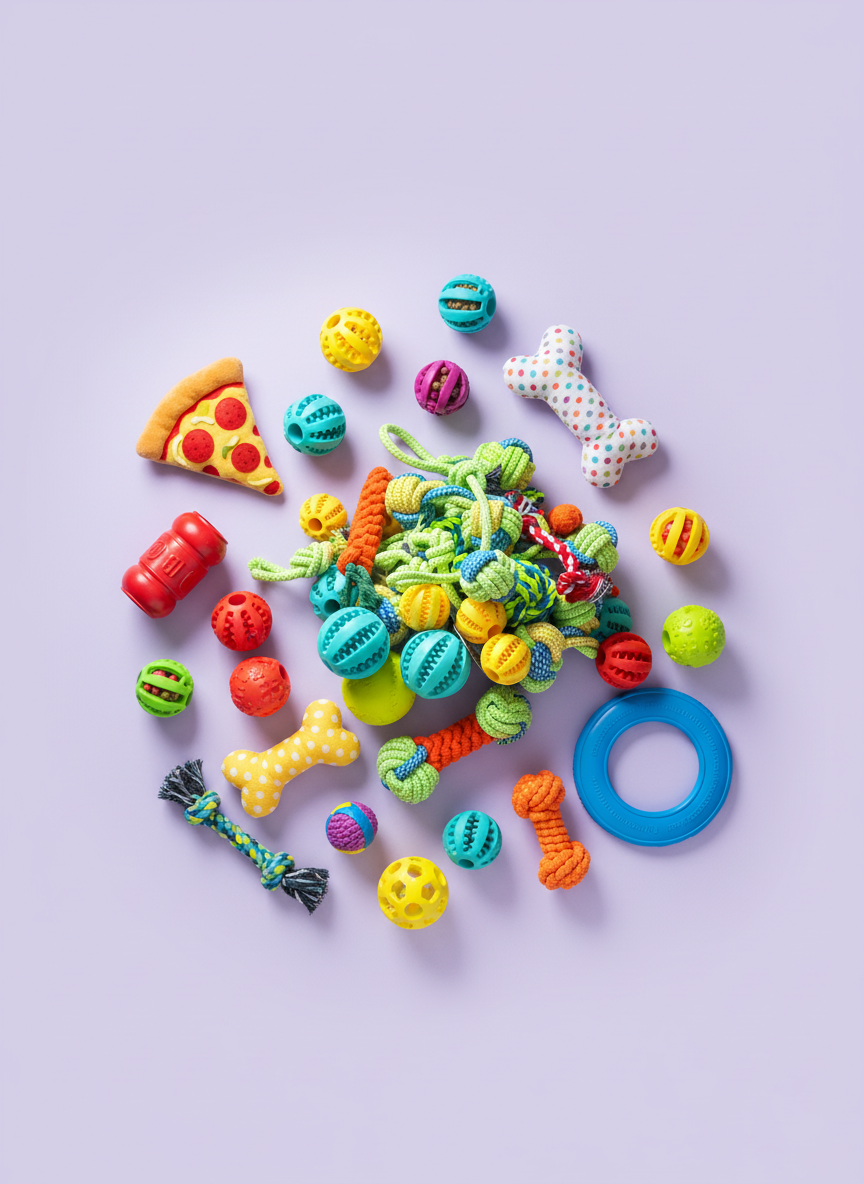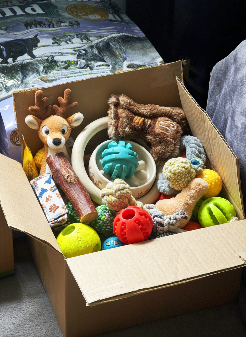 W naszych standardowych boxach znajdziesz miękkie, piszczące i przytulne zabawki - idealne do codziennej zabawy i relaksu.